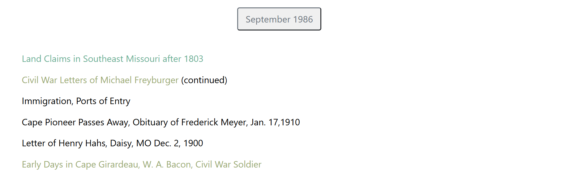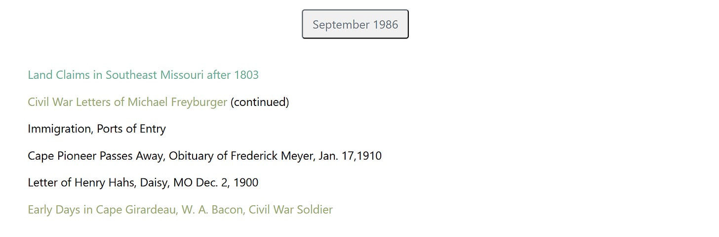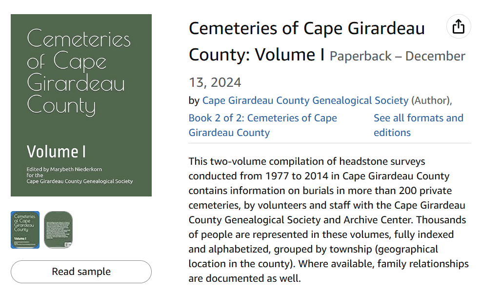 The Cape Girardeau County Genealogical Society has several books for sale on Amazon now, but I need to be provided a complete list to put them all on the publications page. Two are listed, Volume I and II of the Cemeteries of Cape Girardeau County. There may be more. The sale of these books benefit the Genealogical Society and we appreciate your support.